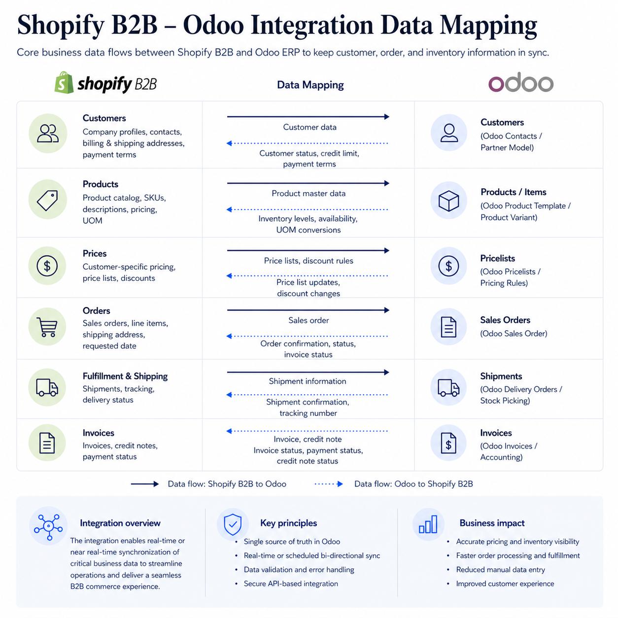 Customer company records and status: Creates and maintains company accounts; credit holds and restrictions enforced immediately. Delivery addresses: Available as shipping options at checkout per company account. Customer contacts: Individual buyer logins scoped to their company account. Pricelist assignments and resolved pricing: Price lists per company account reflecting each customer's contracted rates and volume tiers. Payment terms: Applied automatically at checkout for each company account. Credit status and account restrictions: Enforced at Shopify checkout in real time. Product and item master: Shopify product catalog with titles, descriptions, variants, units of measure. Available inventory by warehouse or location: Real-time Shopify inventory levels. Order confirmation and status: Shopify order status updated as Odoo processes and ships. Shipment and tracking information: Shopify fulfillment record with carrier and tracking number. Tax configurations: Tax exemption and rate handling per customer account.