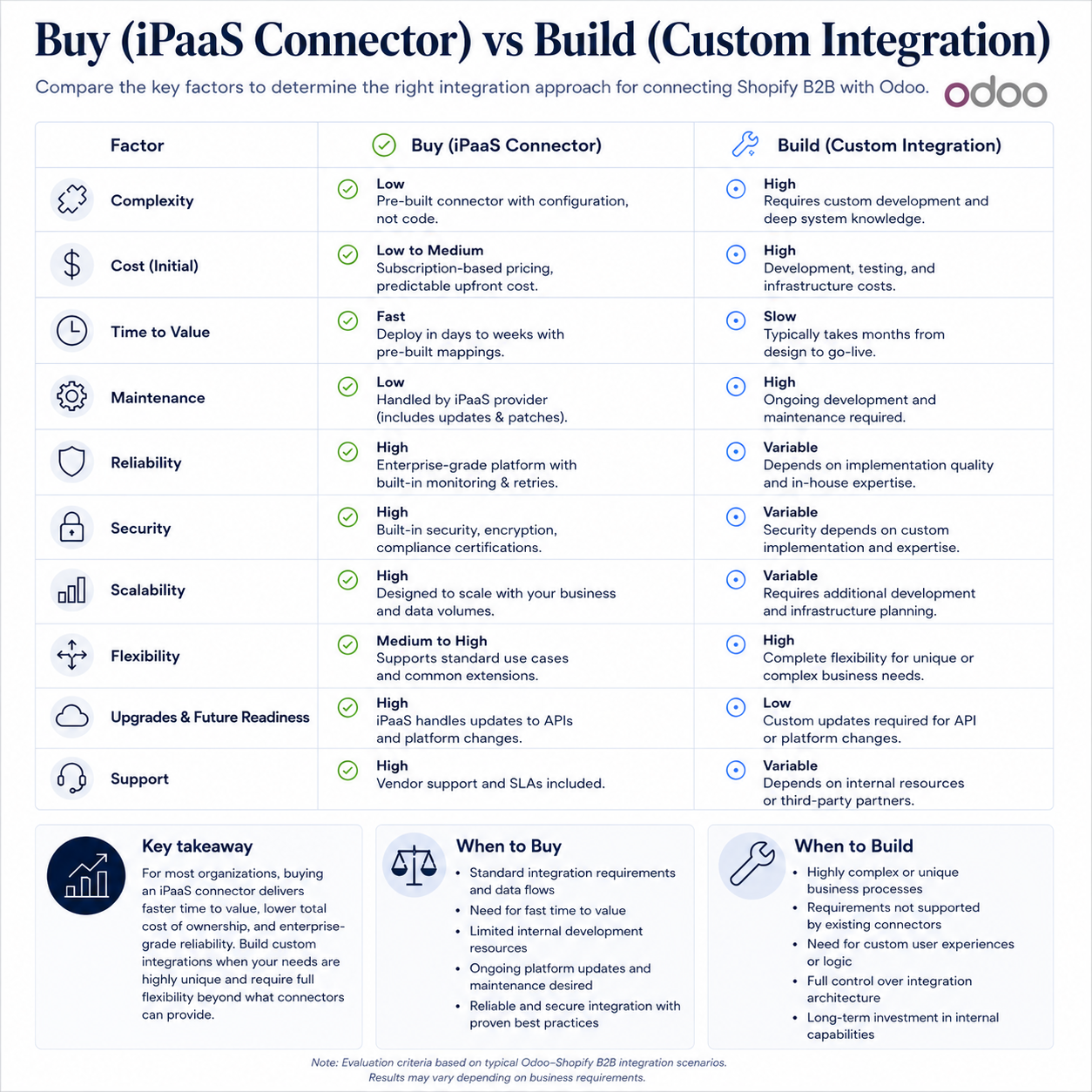 The visible costs surface in operations: pricing corrections on large orders, inventory discrepancies that require manual intervention, customer service calls from buyers who ordered against availability that had already moved. Manufacturers and distributors running Odoo and Shopify through a connector app absorb meaningful operational overhead each week that traces directly to the gap between the two systems.